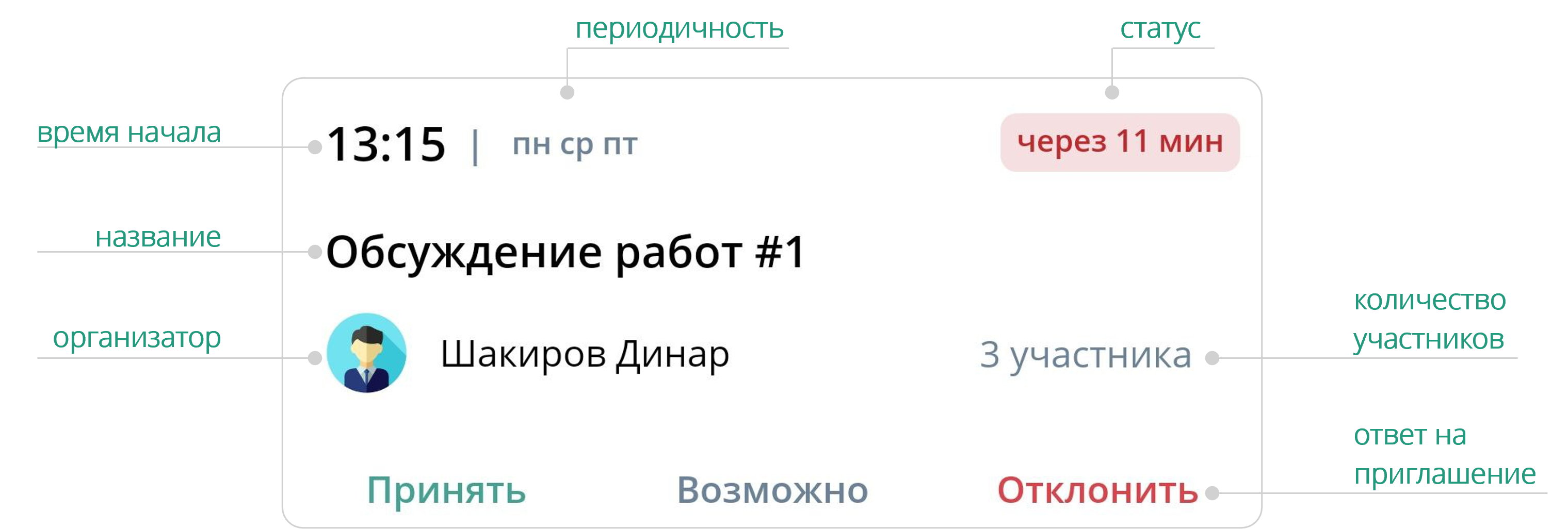 • Возможно — участник добавляется в список участников мероприятия, карточка мероприятия остается в списке мероприятий, но закрашивается серым и в статусе мероприятия отображается Возможно