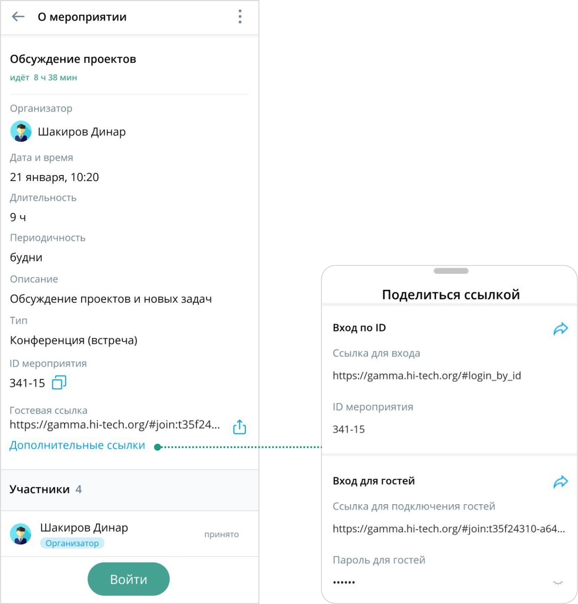 ID мероприятия, Гостевая ссылка видны только Организатору и Модератору мероприятия