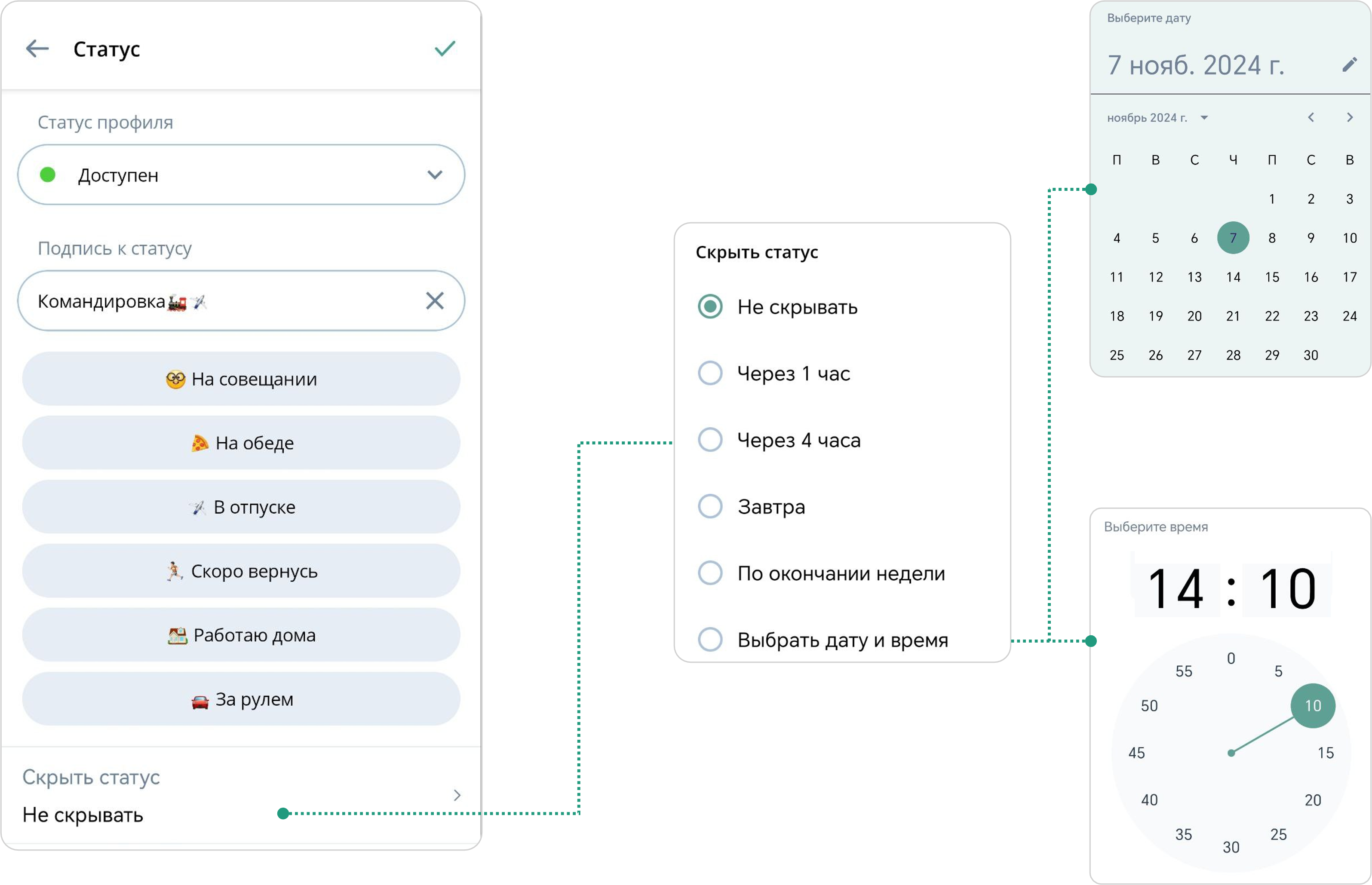 | Подпись к статусу отображается в Платформе в профиле контакта, информации о персональном чате, а также в заголовке персонального чата |