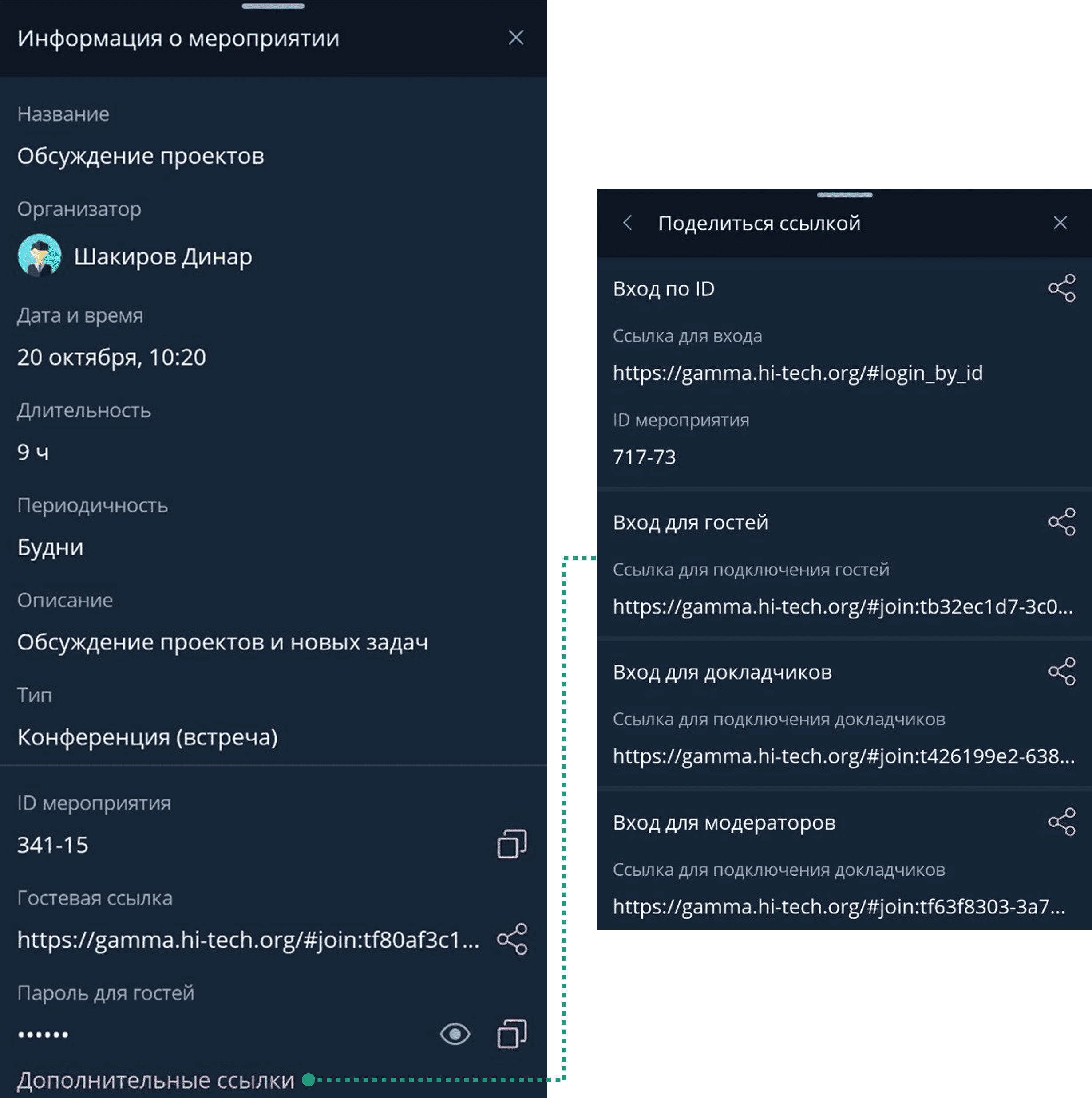 Иконка Копировать копировать ID мероприятия / копировать пароль для гостей