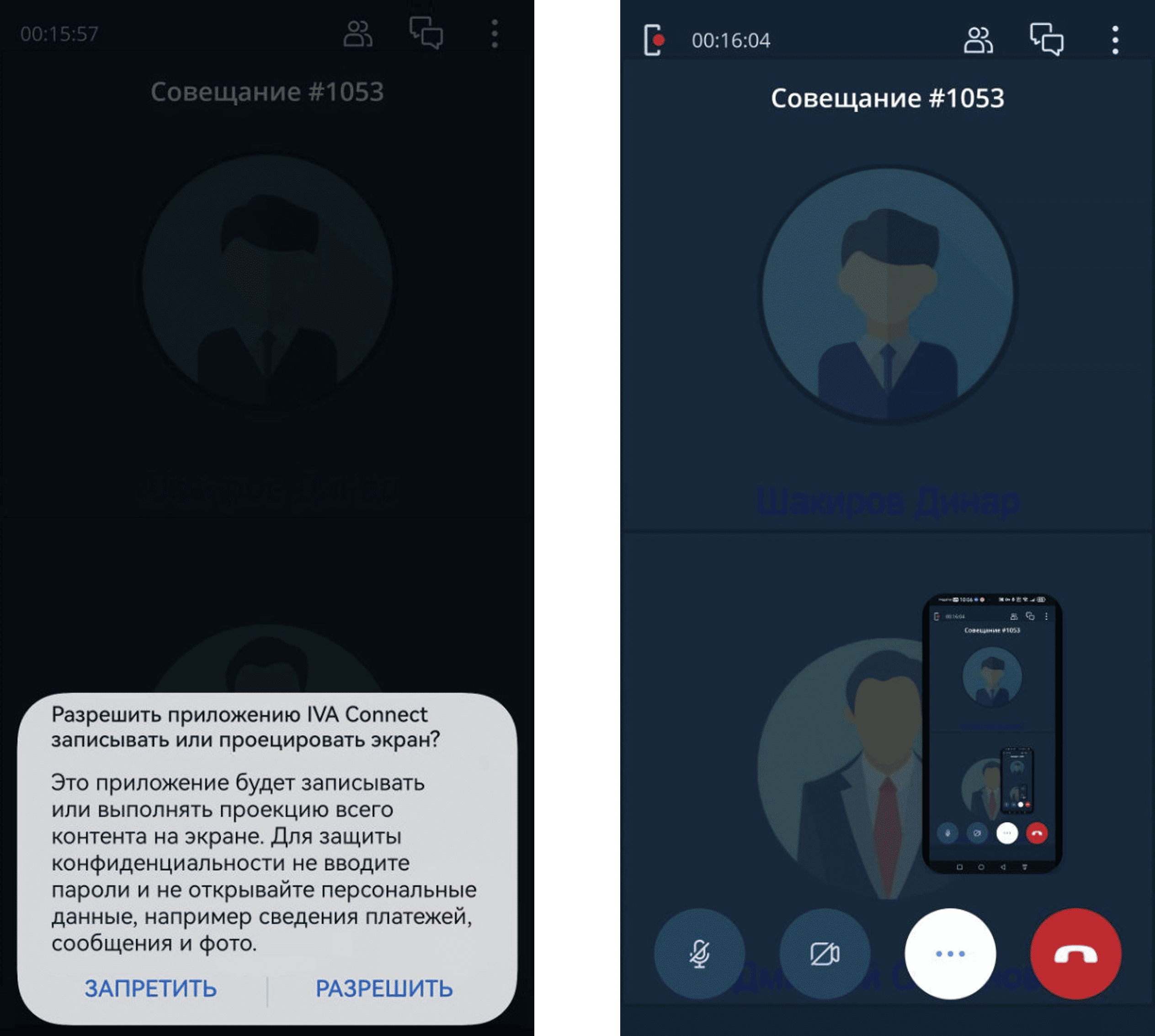 Чтобы остановить множественную демонстрацию экрана, необходимо: Вернуться в приложениеНажать кнопку Иконка Дополнительные действияОстановить демонстрацию Окончание демонстрации либо Остановить из панели уведомлений приложений Android
