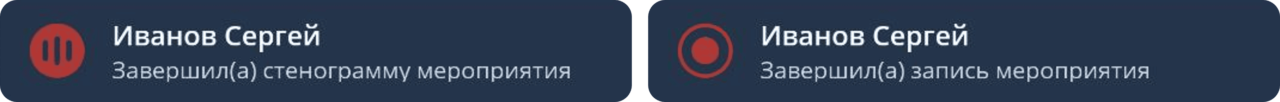 После остановки записи и/или стенограммы мероприятия в рабочей области мероприятия появится информационное сообщение об остановке записи и/или стенограммы мероприятия.