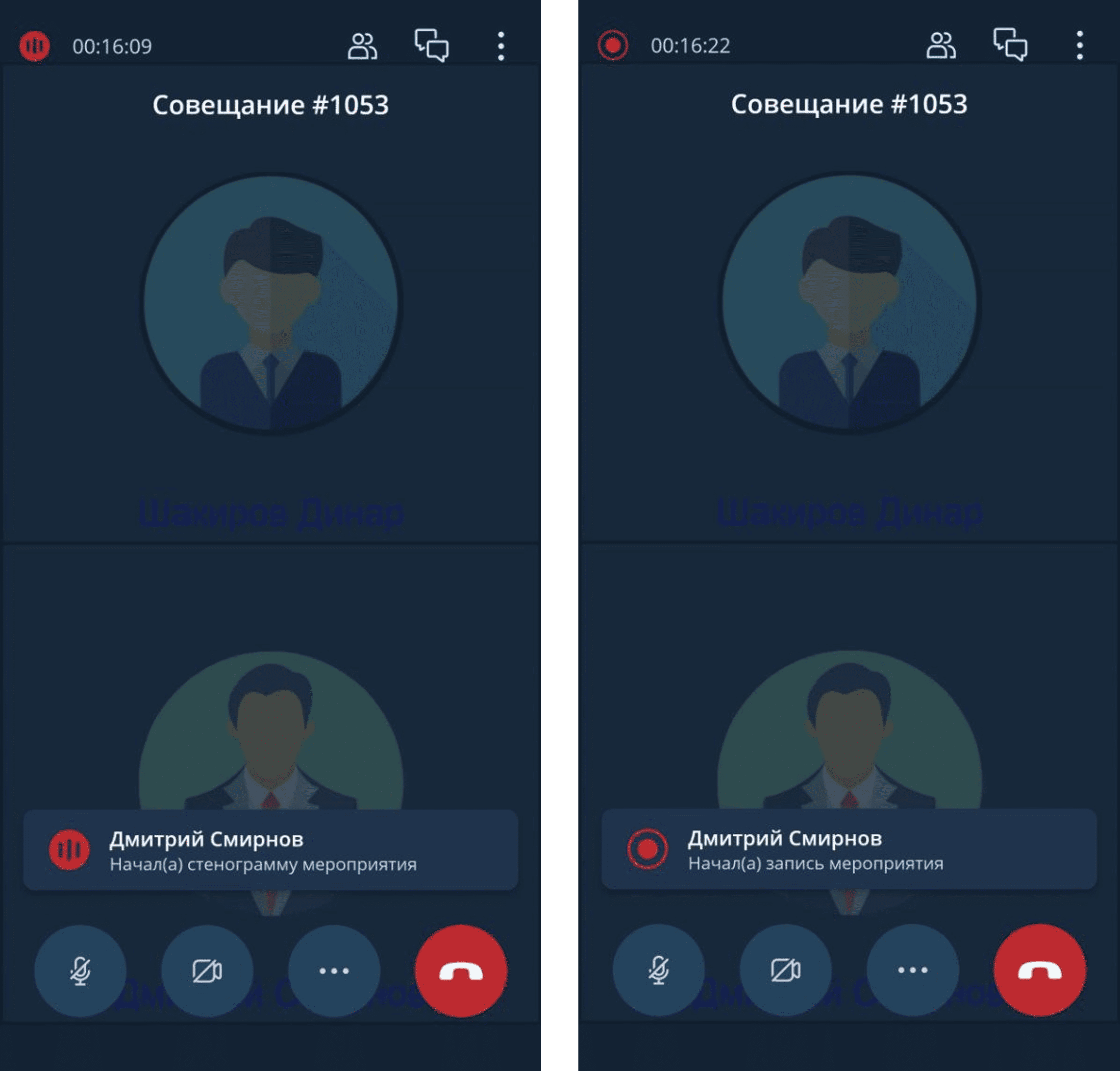 Если во время проведения мероприятия Организатор или Модератор мероприятия начали запись и/или ведение стенограммы мероприятия, то в рабочей области мероприятия отображается постоянная индикация о ведении записи и/или стенограммы и появляется соответствующее информационное сообщение.