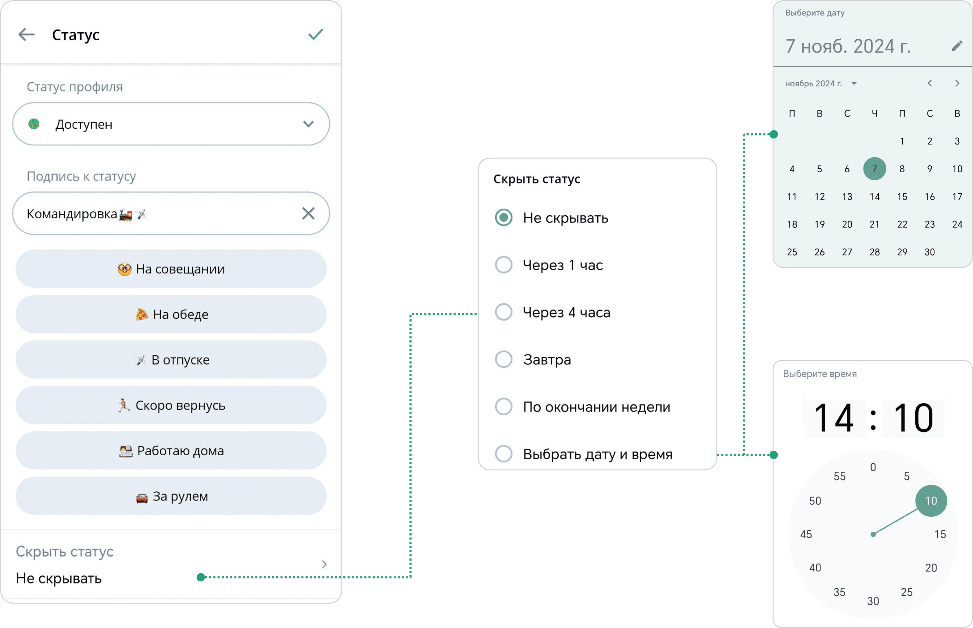 Статус → Поле Скрыть статус → Выбрать значение (через 1 час, через 4 часа, завтра, по окончании недели, выбрать дату и время) → Нажать кнопку