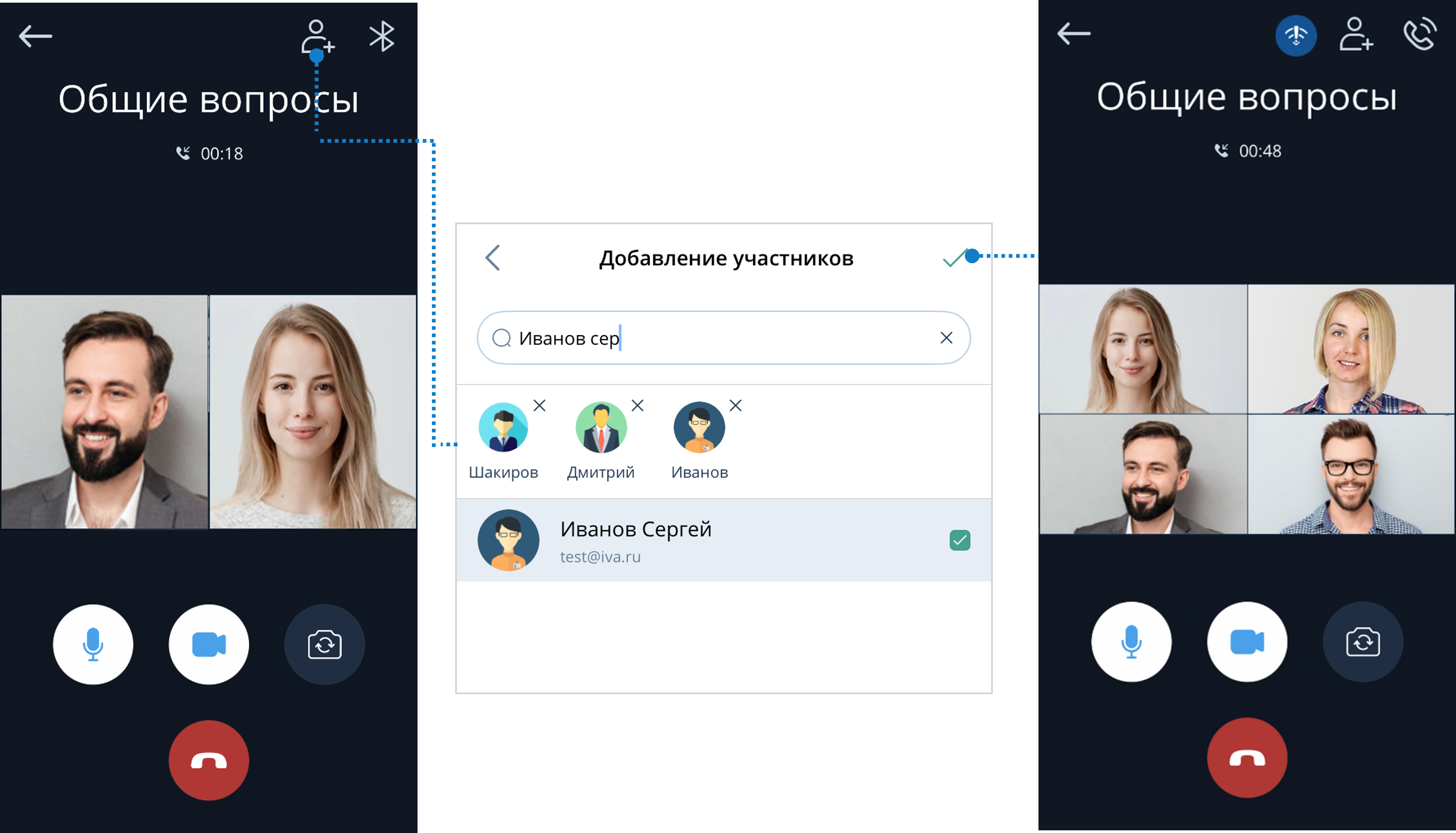 В Приложении существует возможность перехода из персонального звонка в групповой, а также добавления в него новых участников без разрыва соединения и самого звонка, при этом автоматически будет создан новый групповой чат