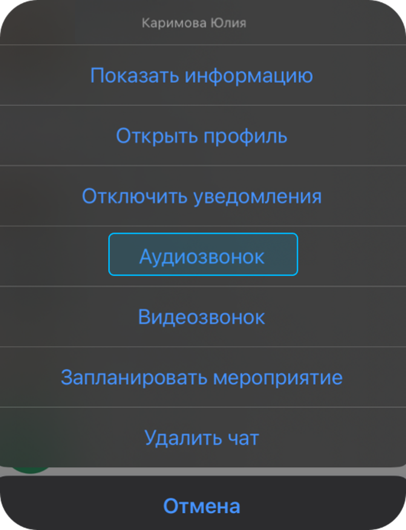 | В силу политики конфиденциальности Apple при сворачивании окна приложения во время видеозвонка трансляция видео от участника приостановится системой iOS. Видеотрансляция участника автоматически возобновится при возврате в окно приложения |