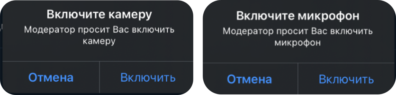 | Для удаленного управления трансляцией аудио / видео участников мероприятия Организатору / Модератору требуется соответствующее подтверждение от участников |