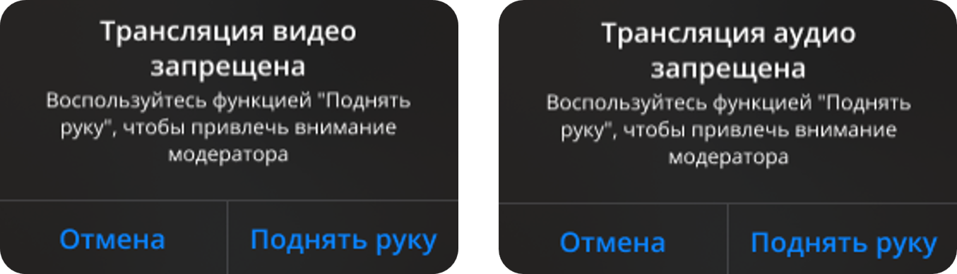 | Если Организатор / Модератор мероприятия ограничил пользователю возможность аудио- или видеотрансляции, то для данного пользователя отобразится соответствующее уведомление |