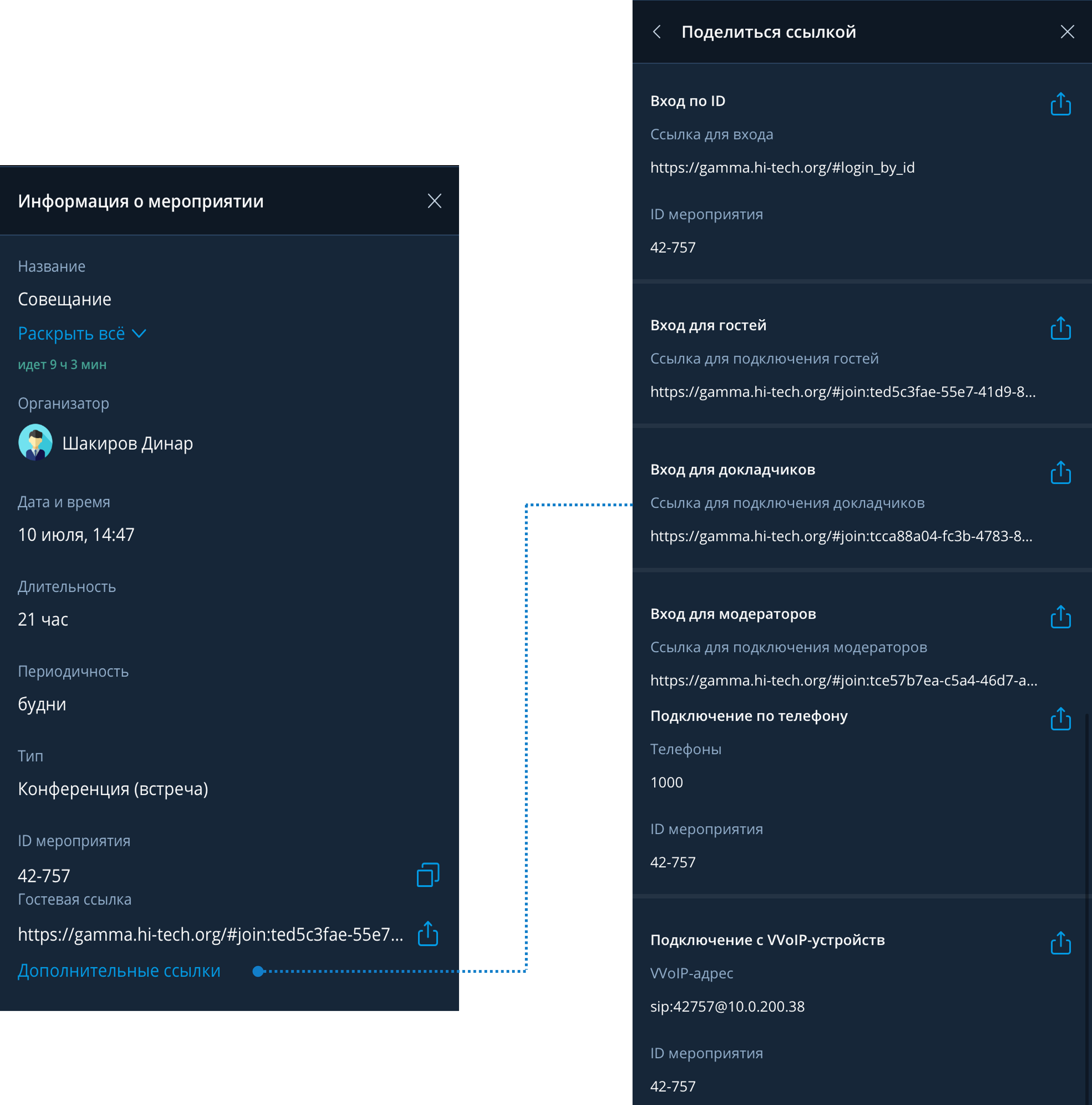 | Видимость гостевой и дополнительных ссылок зависит от настроек мероприятия и настраивается Организатором / Модератором мероприятия в IVA Connect Desktop и IVA WEB |