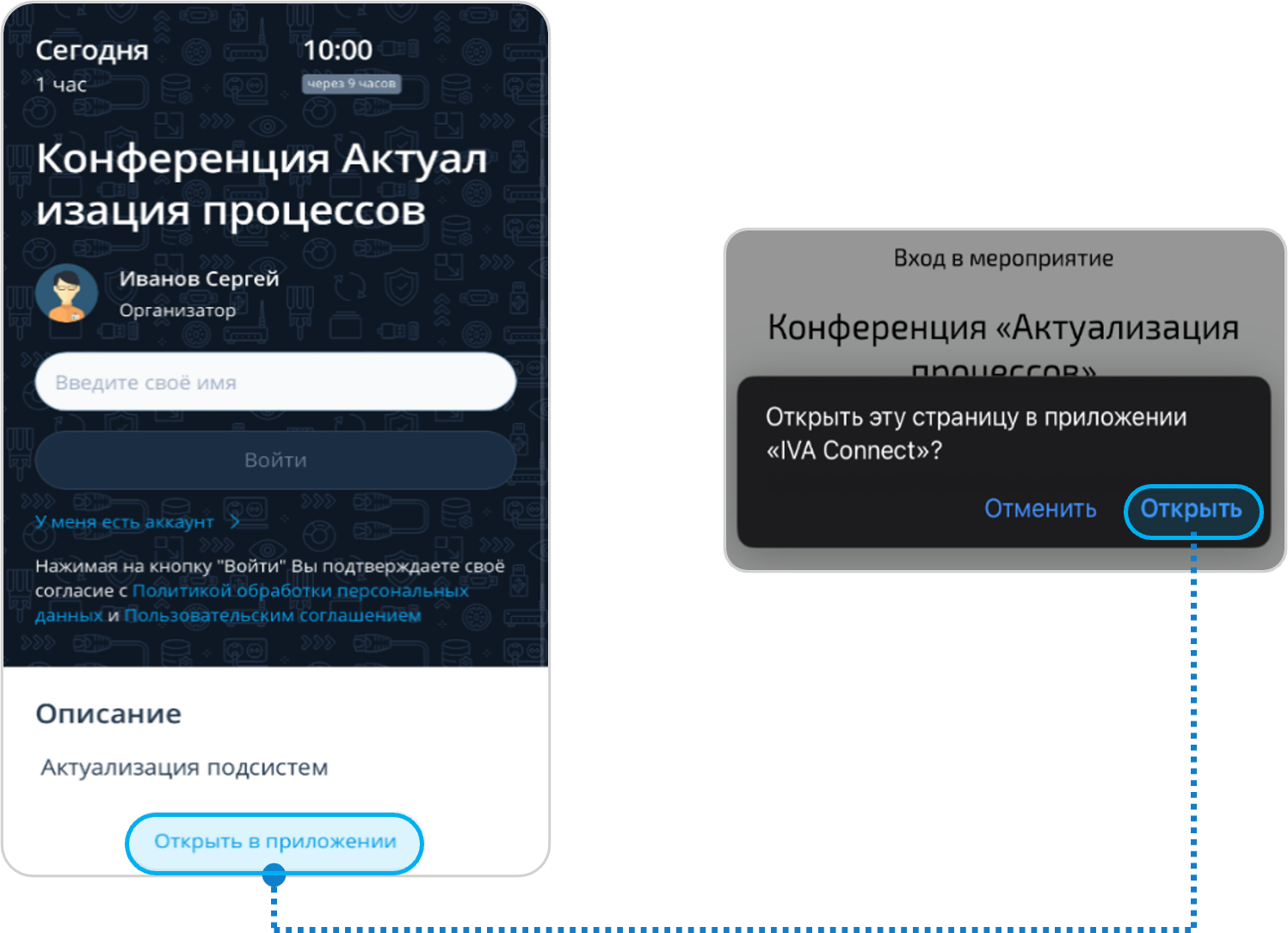Перейти по ссылке, отправленной Организатором / Модератором → Нажать Открыть в приложении → Нажать кнопку Открыть