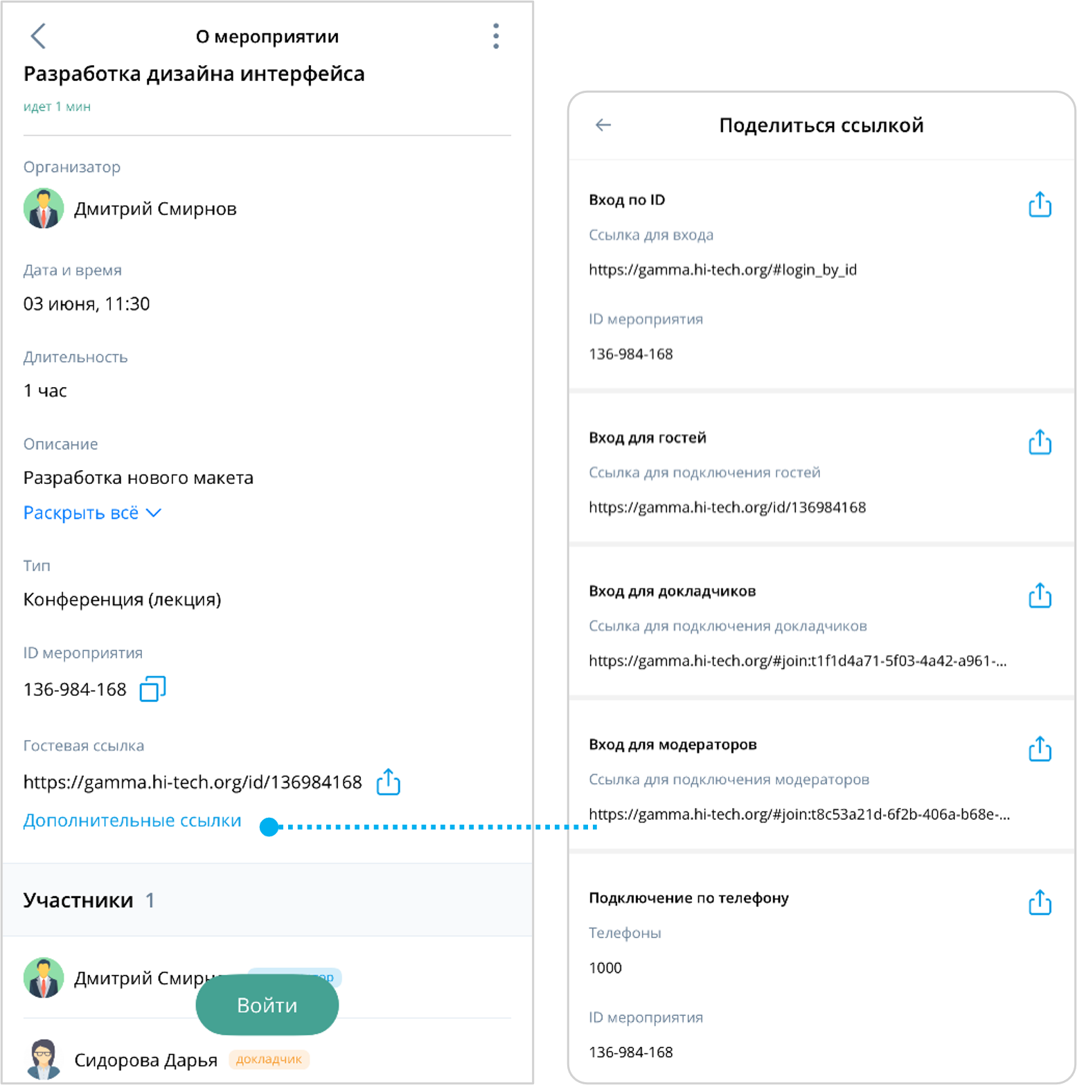 | ID мероприятия, Гостевая ссылка видны только Организатору и Модератору мероприятия |