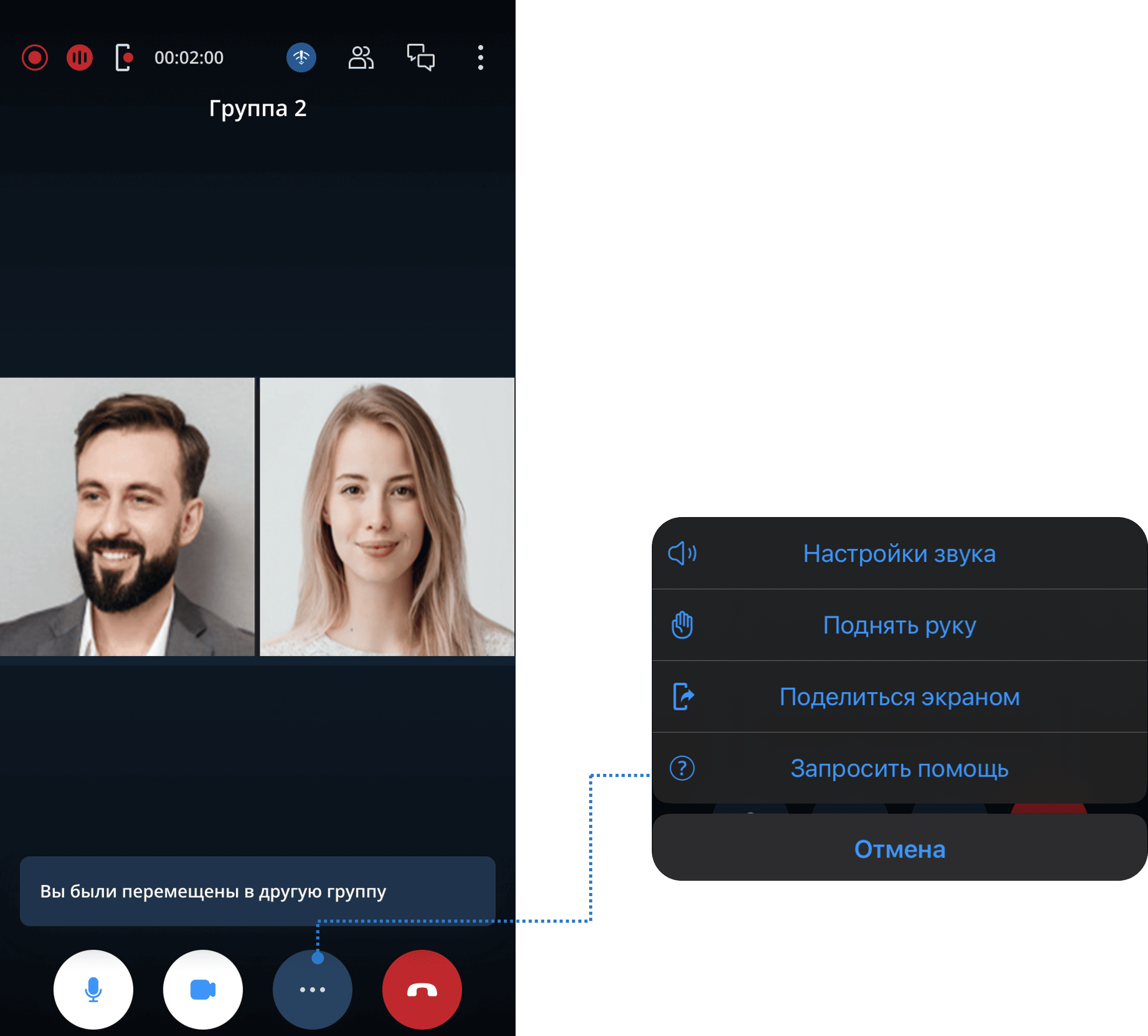 Находясь в группе, участник может запросить помощь у Организатора / Модератора мероприятия: Нажать кнопку