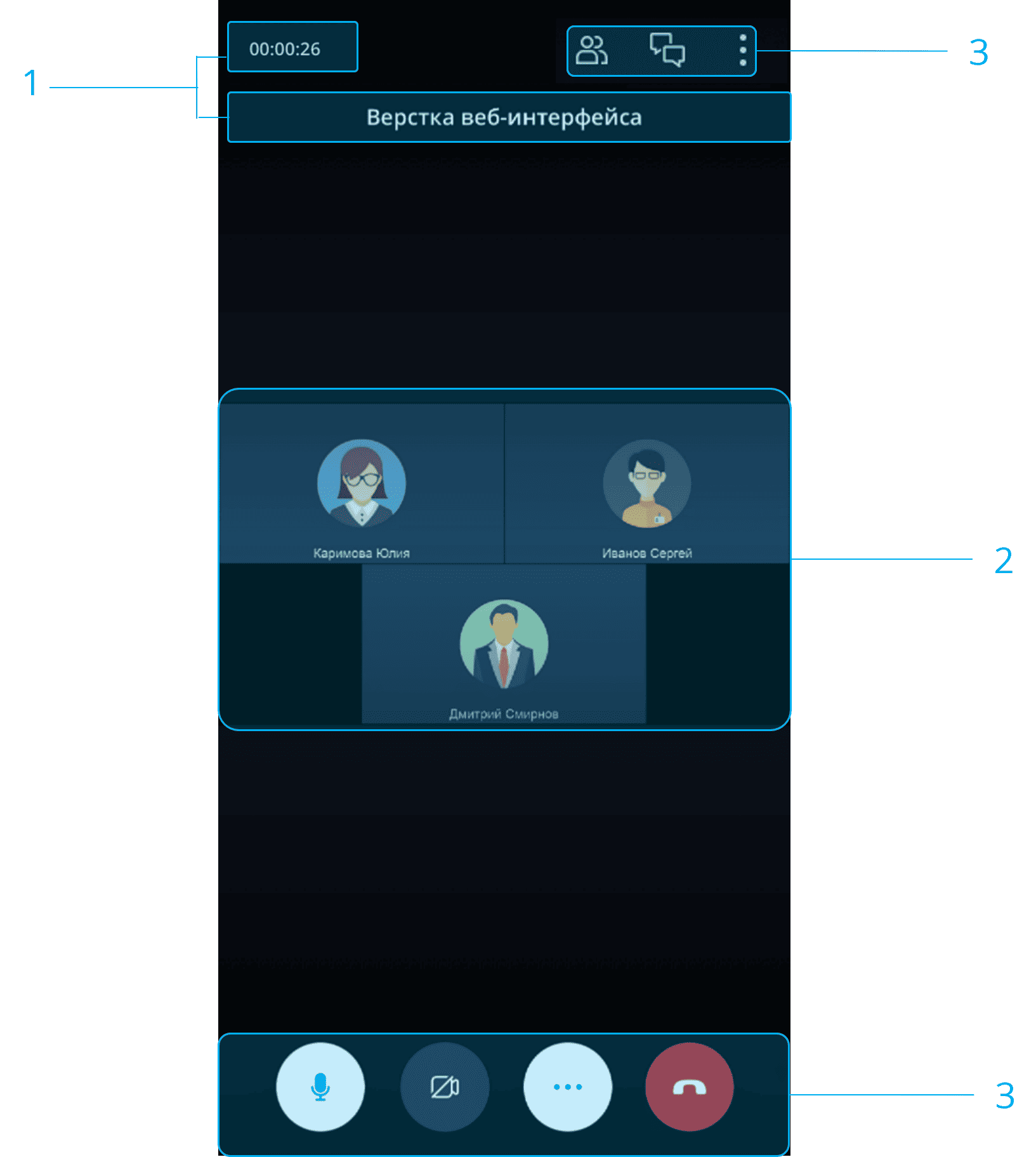 Интерфейс мероприятия Элементы рабочей области мероприятия Информация о мероприятии: продолжительность название Область трансляции Панель управления Комнаты Область трансляции