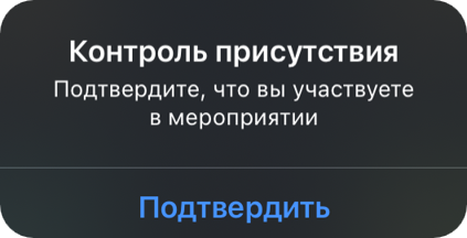 Если в настройках мероприятия был включен Контроль присутствия, то во время проведения мероприятия Организатор, Модератор или Докладчик могут активировать проверку присутствия участников. В рабочей области мероприятия для Рядовых участников и Докладчиков (если включена обязательность проверки для Докладчиков) отобразится окно проверки контроля присутствия. Включение настройки и управление функцией контроля присутствия доступно только в IVA WEB. Для прохождения контроля присутствия: Окно Контроль присутствия → Нажать кнопку Подтвердить |