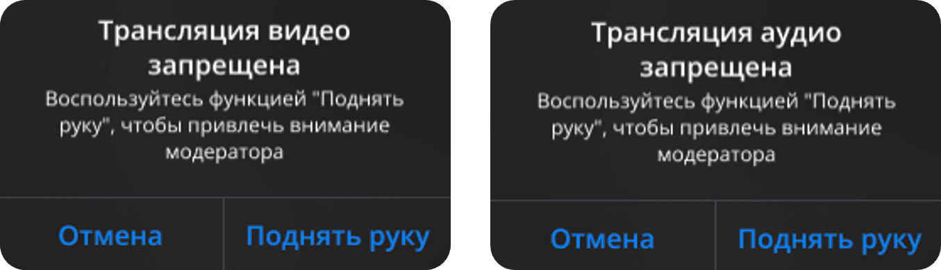| Если Организатор / Модератор мероприятия ограничил пользователю возможность аудио- или видеотрансляции, то для данного пользователя отобразится соответствующее уведомление |