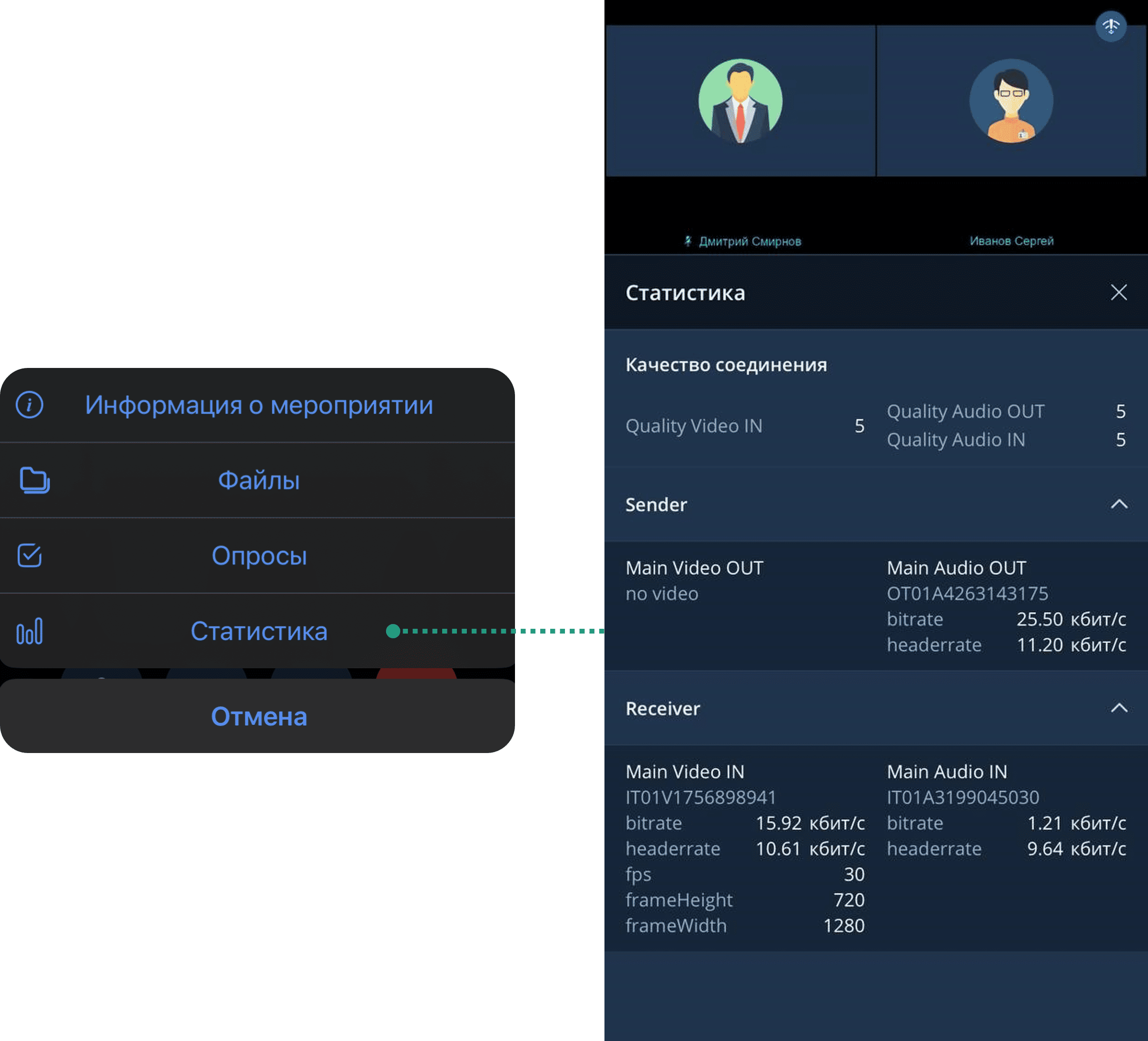 Участник мероприятия может посмотреть параметры входящих / исходящих аудио- и видеоканалов в разделе Статистика во время проведения мероприятия.