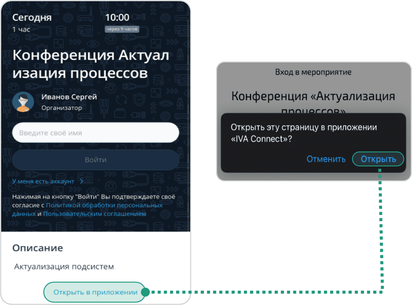 Перейти по ссылке, отправленной Организатором / Модератором → Нажать Открыть в приложении → Нажать кнопку Открыть