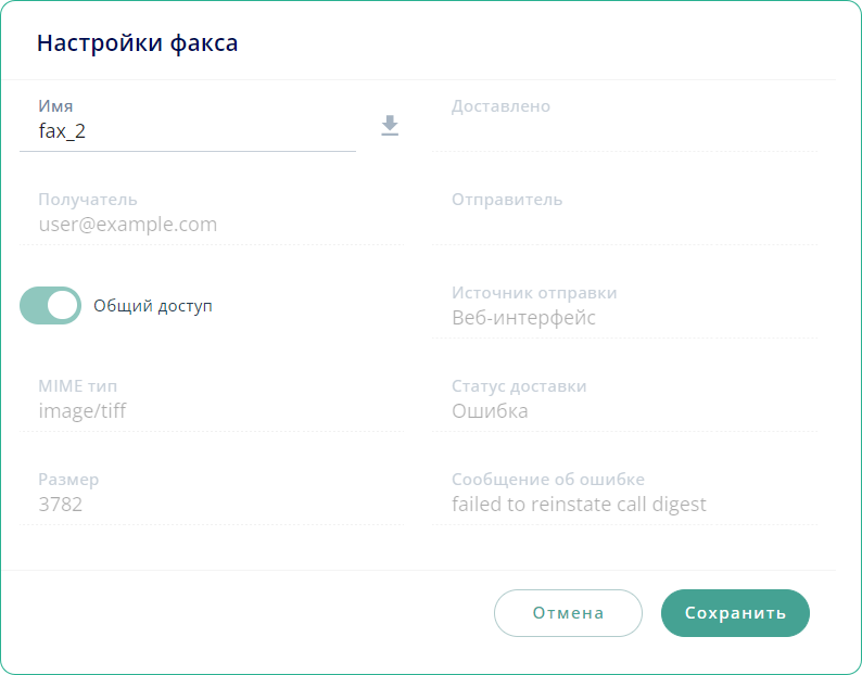 Если переключатель Общий доступ находится в активном состоянии, то факс будет доступен всем пользователям системы, в противном случае — только пользователю, загрузившему данный факс -