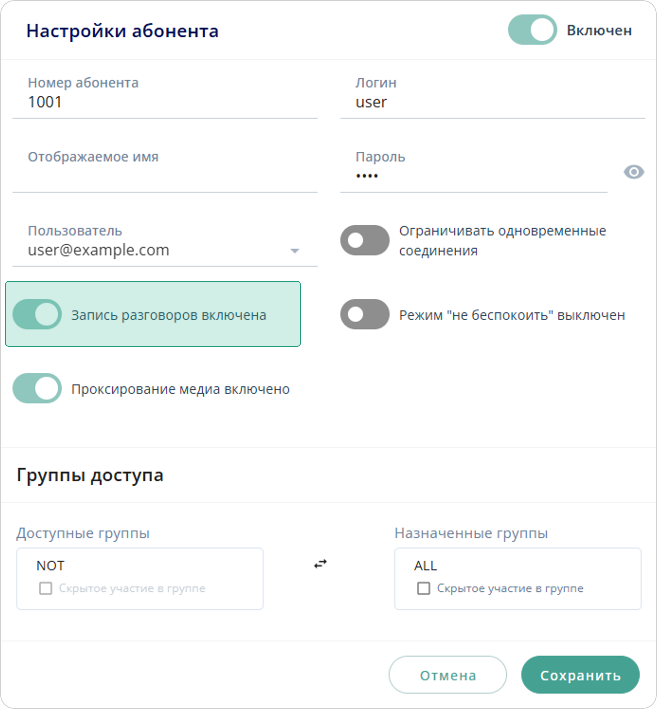 | При включённой опции записи разговоров, абонентам, находящемся в звонке, проигрывается сообщение о том, что ведётся запись разговора |