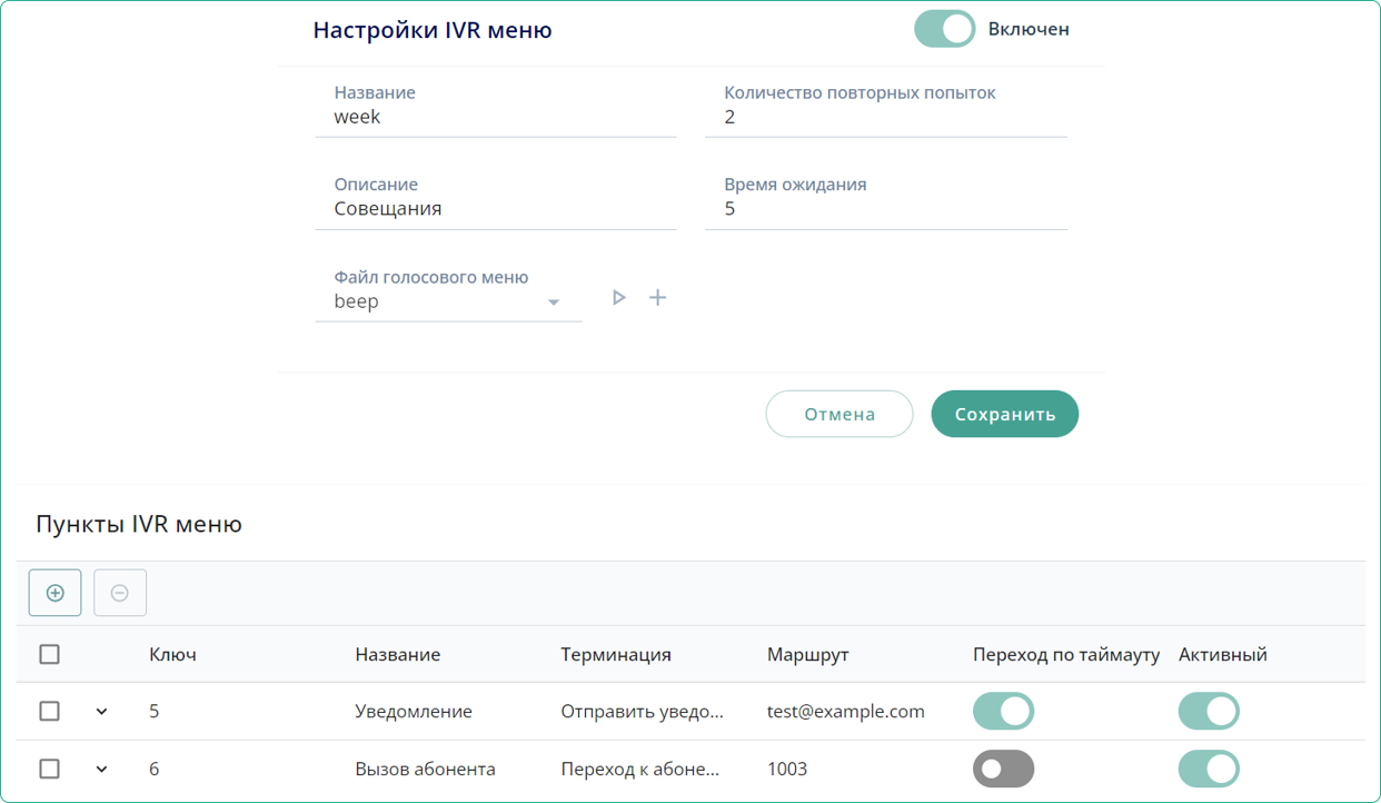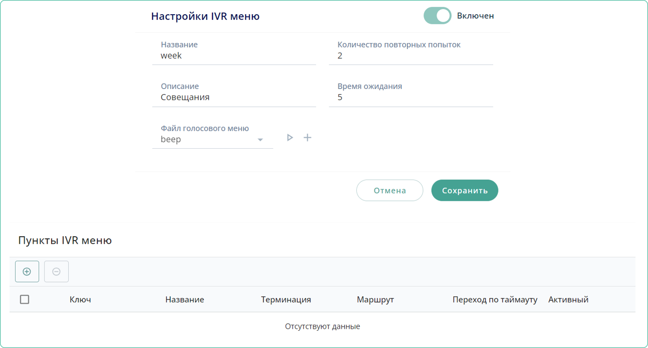 1. окно Настройки IVR меню → секция Пункты IVR меню