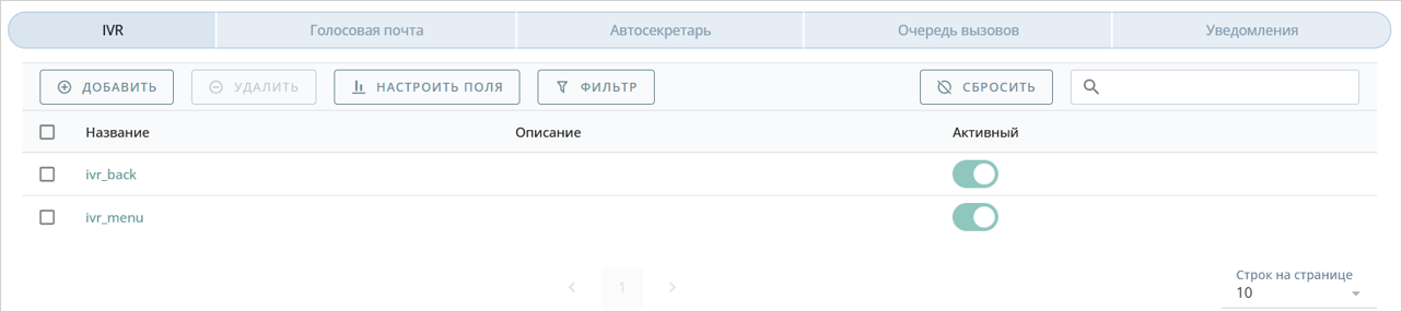 Раздел Сервисы → Вкладка IVR → Перевести в строке выбранного IVR меню переключатель Активный Кнопка ON в неактивное положение Кнопка OFF