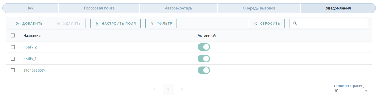 Раздел Сервисы → Вкладка Уведомления → Перевести в строке выбранного сервиса переключатель Активный