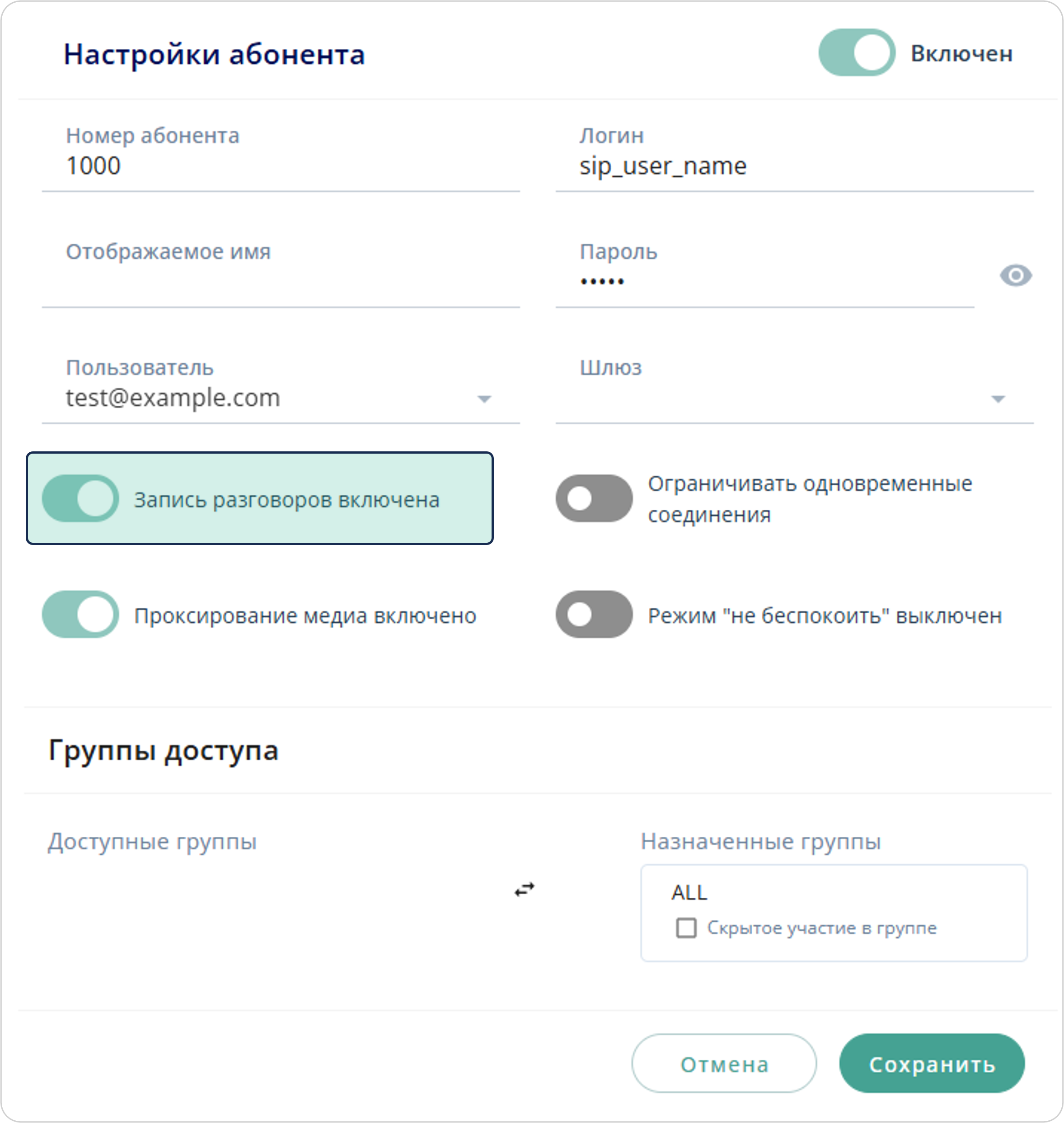 | При включённой опции записи разговоров, абонентам, находящемся в звонке, проигрывается сообщение о том, что ведётся запись разговора |