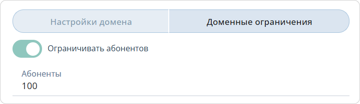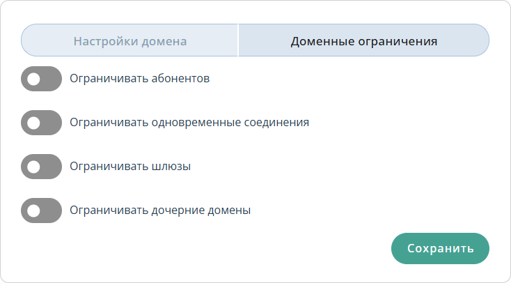 возможность настройки доменных ограничений для каждого домена (количество абонентов, шлюзов, одновременных соединений, дочерних доменов)