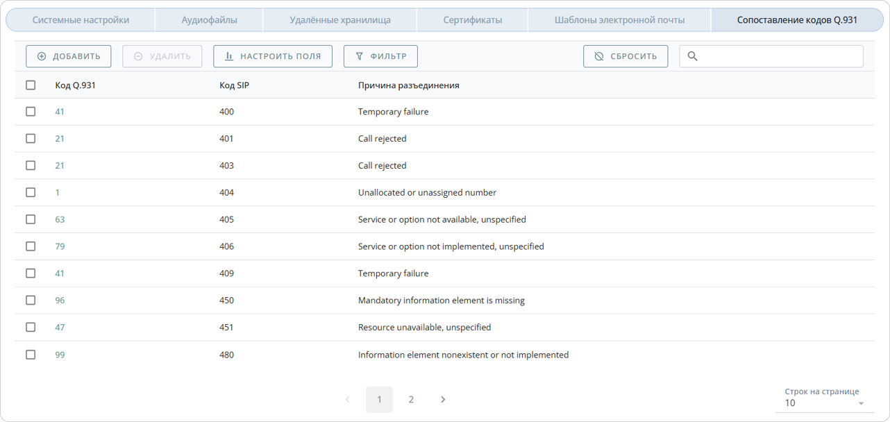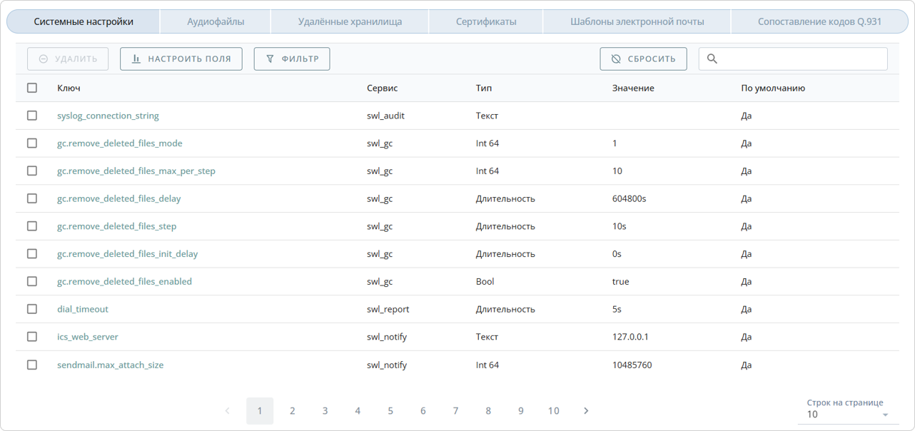 Во вкладке Удалённые хранилища отображаются все внешние хранилища, используемые в системе и предназначенные для выгрузки, хранения аудиофайлов и CDR.