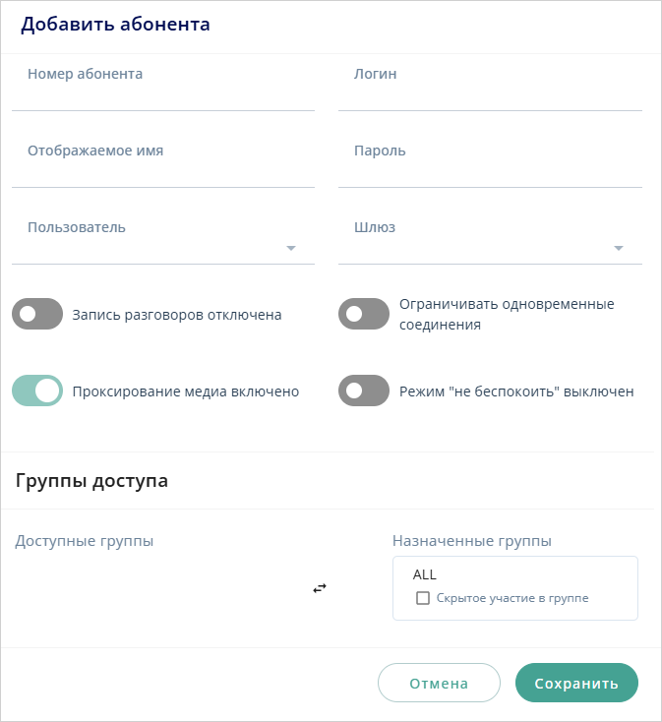 При создании абонента автоматически создаётся один терминал абонента, работающий по протоколу SIP, с регистрацией по данному протоколу и SIP логином / паролем, указанным при создании абонента.
