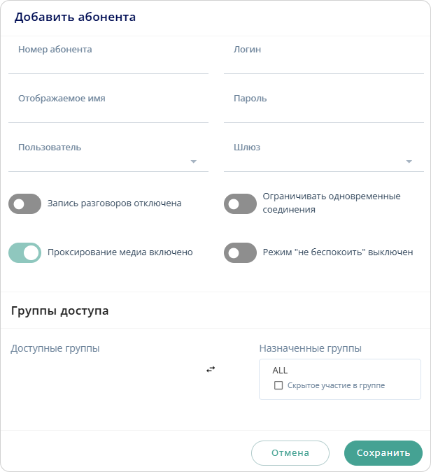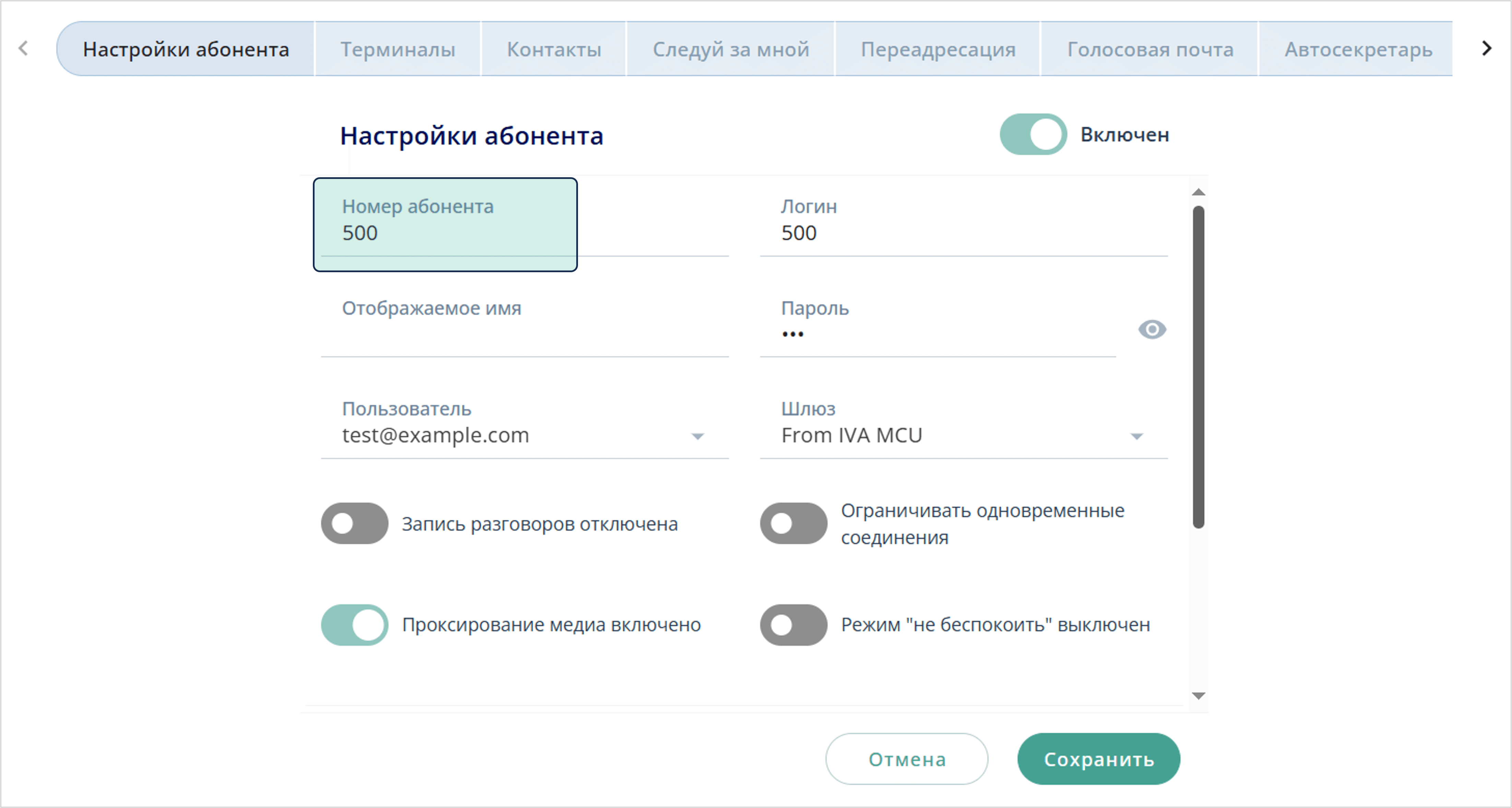 500Номер абонента должен совпадать со значением Номер УАТС для пользователя user500, зарегистрированного в Платформе IVA MCU, например 500 -