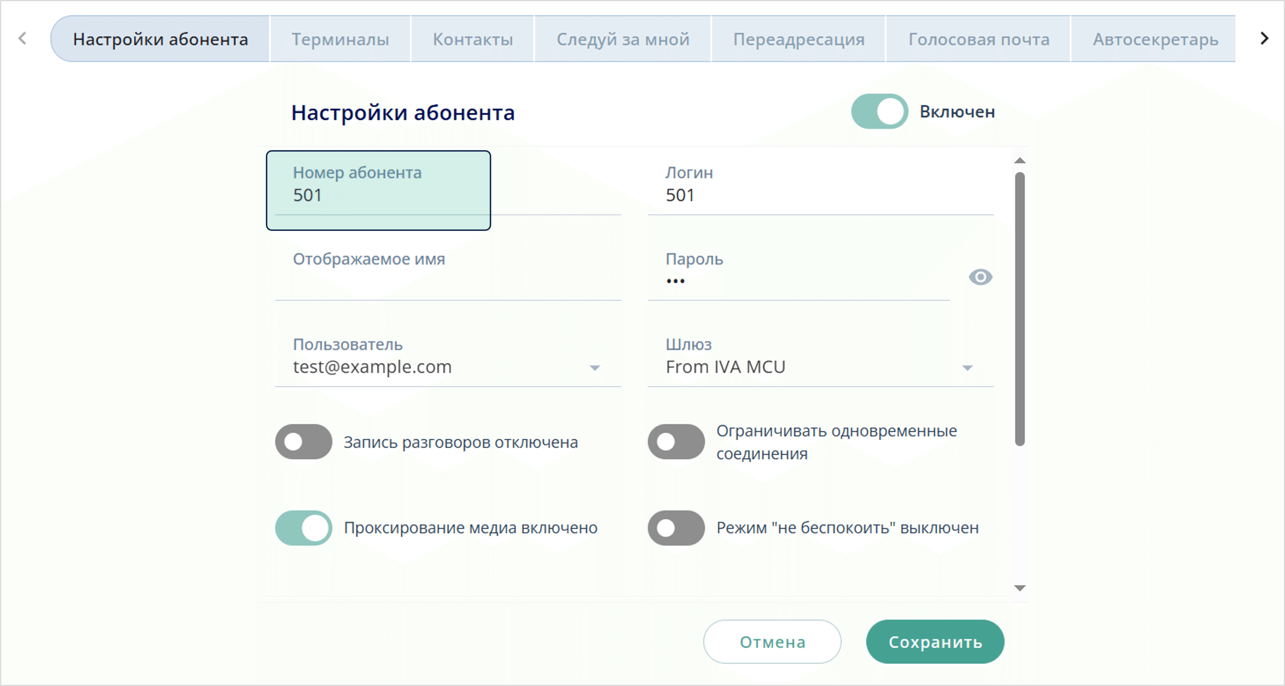 501Номер абонента должен совпадать со значением Номер УАТС для пользователя user501, зарегистрированного в Платформе IVA MCU, например 501 -