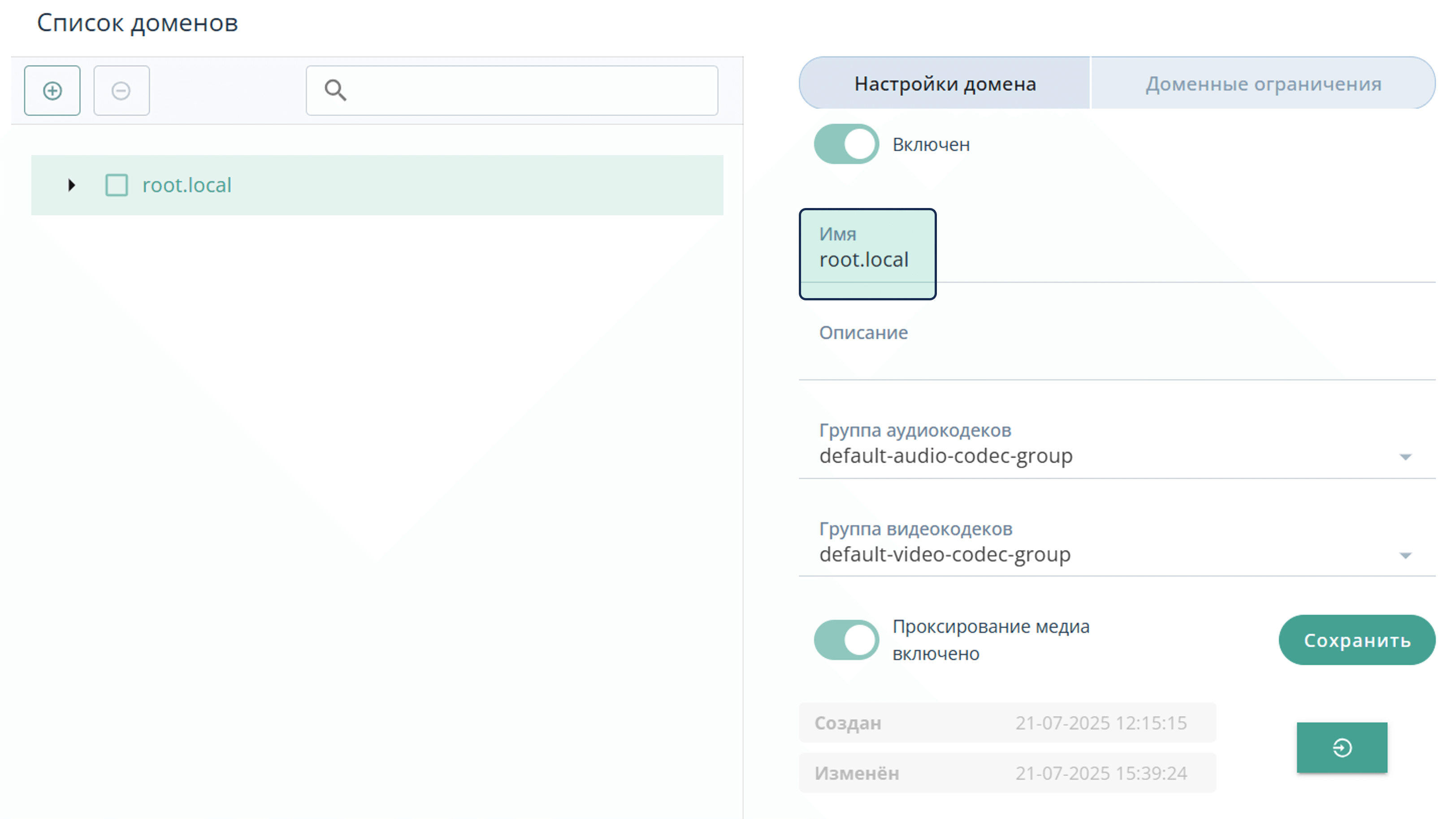 перейти в раздел Домены → выбрать домен и нажать кнопку Детально → секция Настройки VVoIP