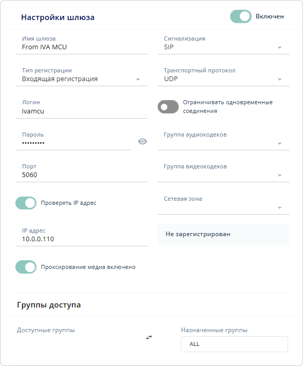 ivamcupwdЛогин и Пароль могут быть любыми, но должны совпадать с логином и паролем удаленного шлюза, регистрируемого в Платформе IVA MCU -