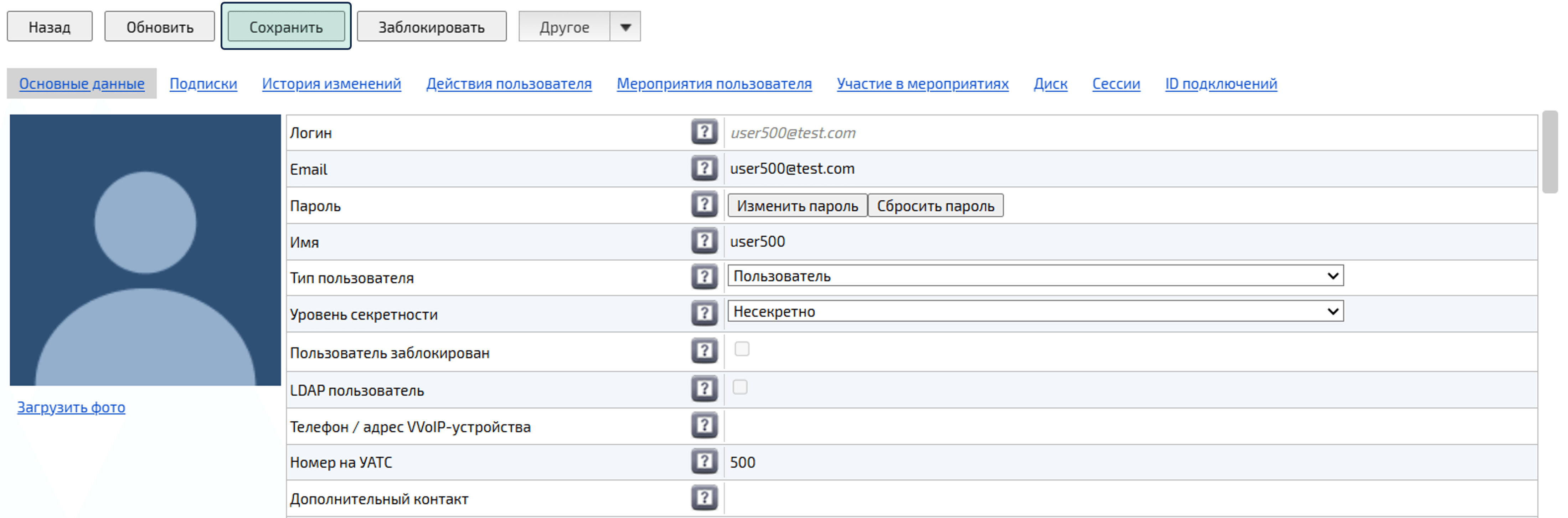 в разделе Пользователи выбрать пользователя с именем user500 и нажать кнопку Детально