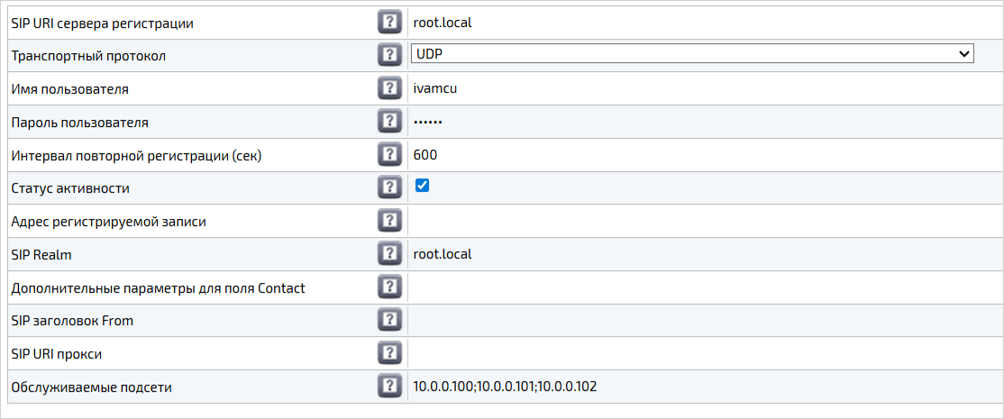 поле SIP URI сервера регистрации: родительский домен сервера телефонии IVA CS