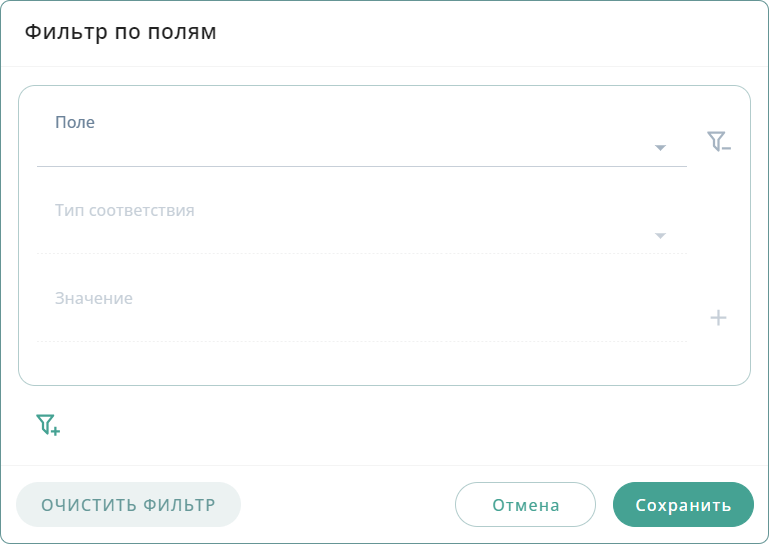 → Ввести данные: Поле, Тип соответствия, Значение → Нажать кнопку