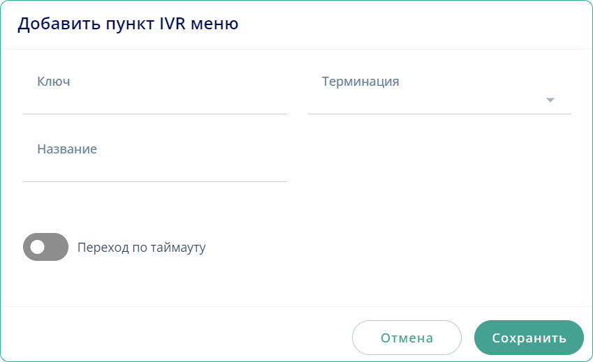 При наличии нескольких пунктов IVR меню система ожидает выбор пользователя. Если за заданный интервал времени пользователь ничего не выбирает, то срабатывает пункт меню, для которого активирована опция Переход по таймауту