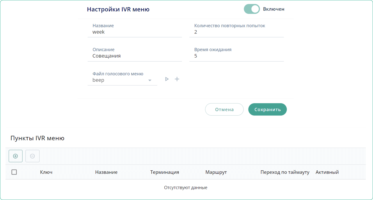 Настройки IVR меню