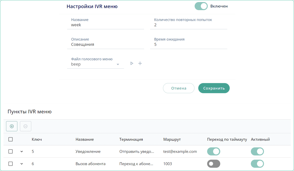 Настройка пунктов IVR меню