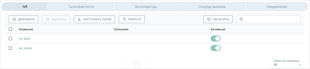 Раздел Сервисы → Вкладка IVR → Перевести в строке выбранного IVR меню переключатель Активный Кнопка ON в неактивное положение Кнопка OFF
