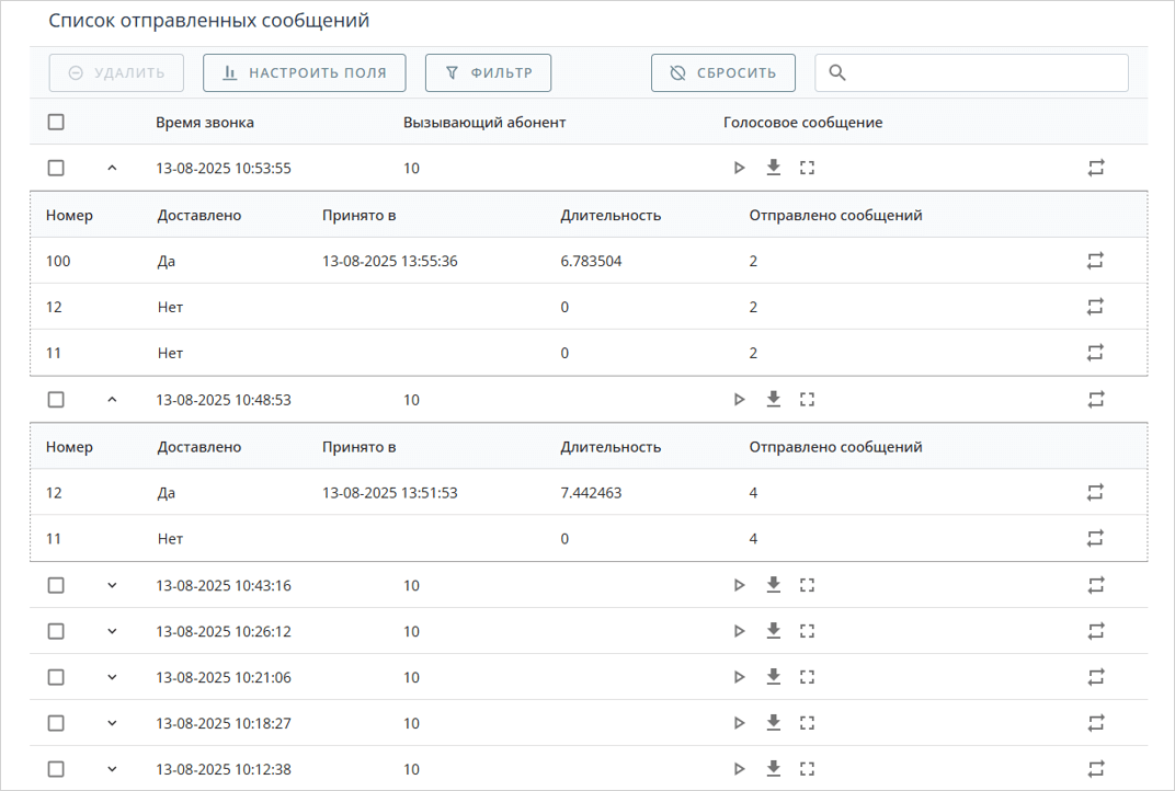 Прослушать голосовые сообщения можно в секции Список отправленных сообщений.