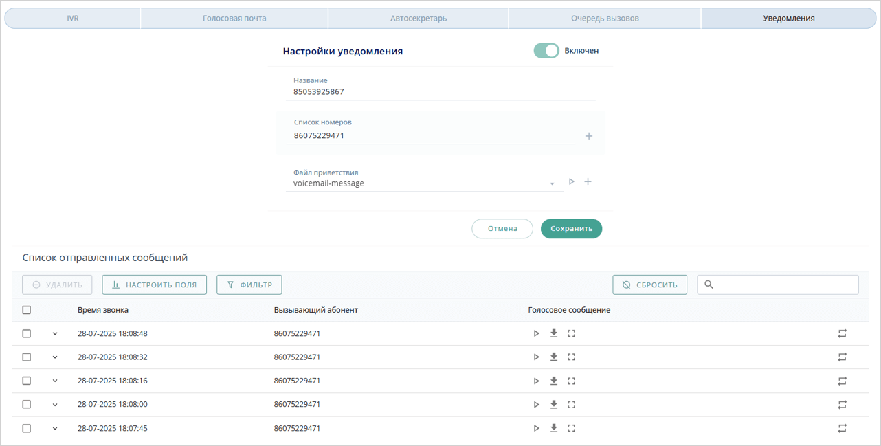 Сервис Уведомления позволяет записать голосовое сообщение при звонке на маршрут для дальнейшей рассылки сообщения списку пользователей.