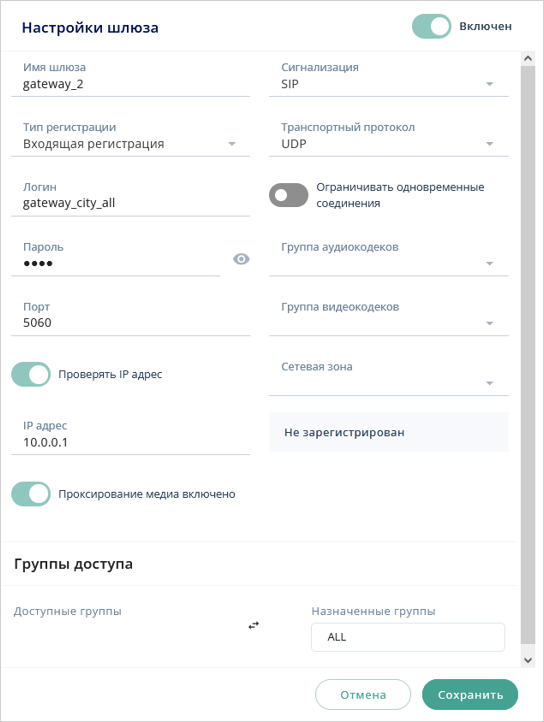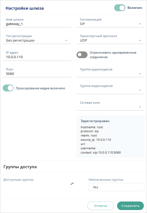 раздел Шлюзы → выбрать зарегистрированный шлюз нажав на имя шлюза (в строке выбранного шлюза переключатель Активный находится в положении