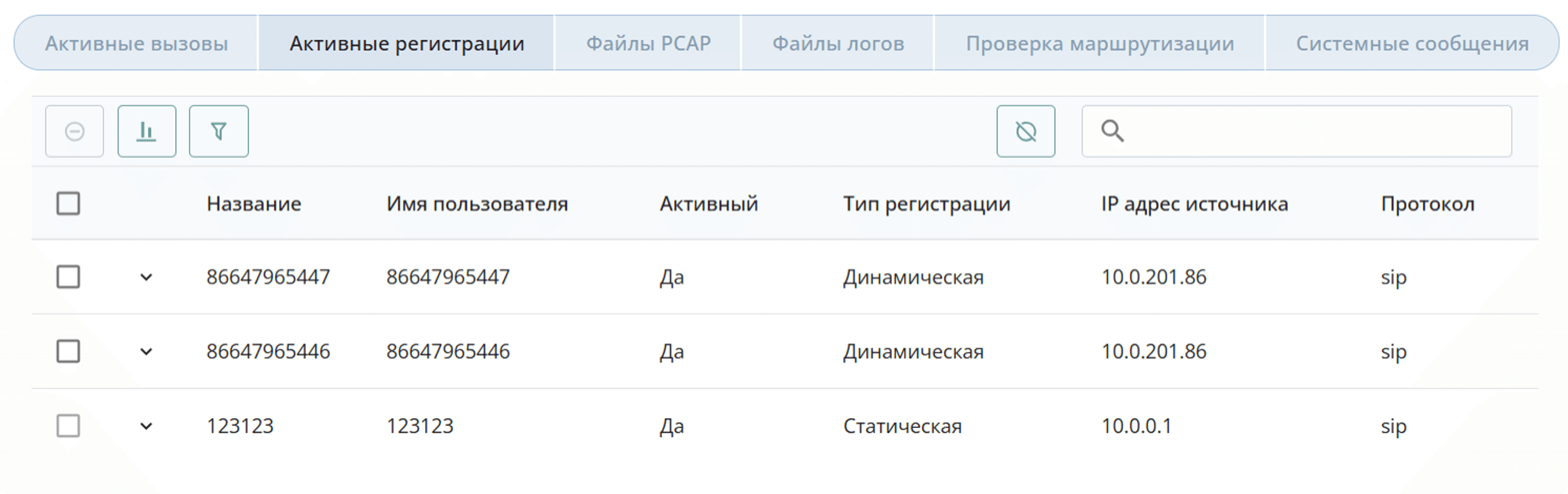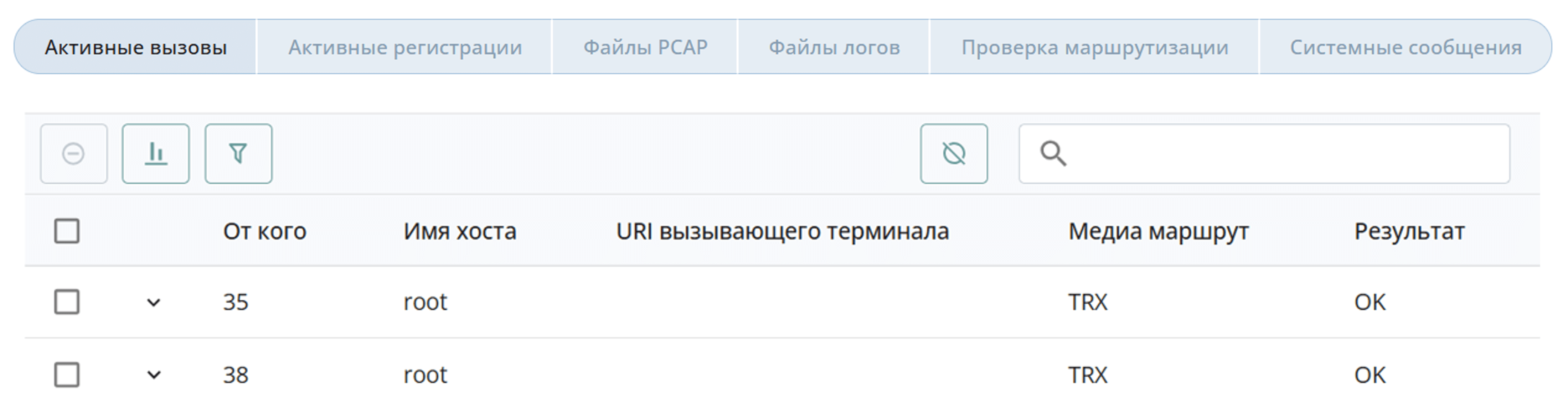 В разделе Мониторинг отображается информация обо всех активных вызовах и активных регистрациях.