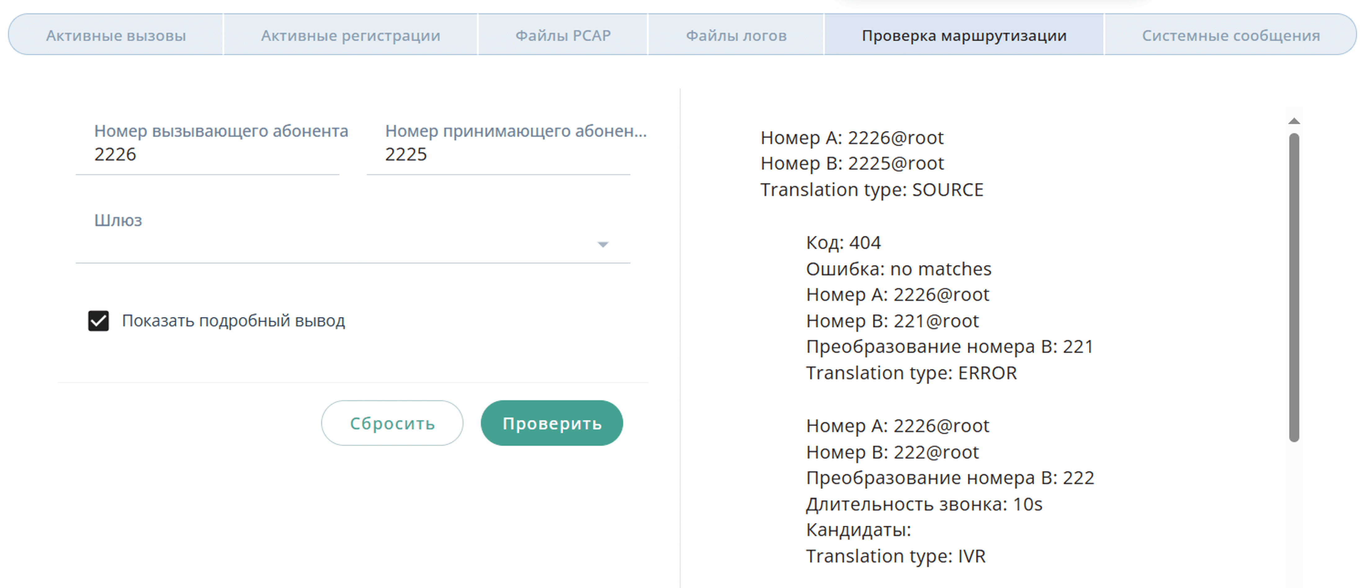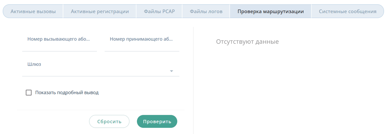 Во вкладке Проверка маршрутизации можно выполнить тестовый звонок для проверки настроенного маршрута.