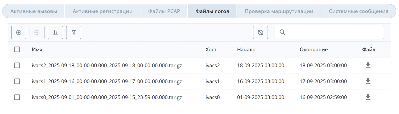 Также в данном разделе можно сгенерировать и выгрузить файлы системных логов и PCAP-файлы сервера телефонии IVA CS, выполнить проверку маршрутизации, а также просмотреть системные сообщения.