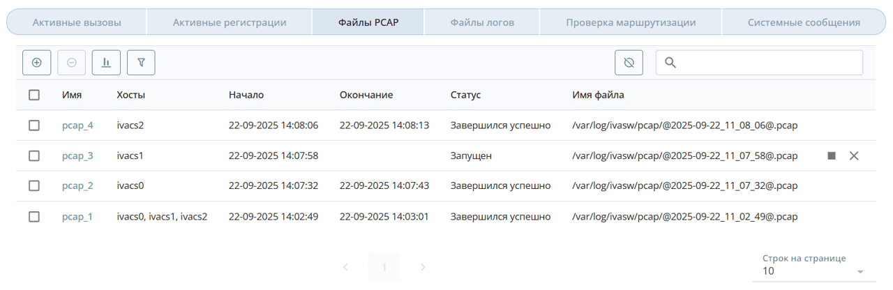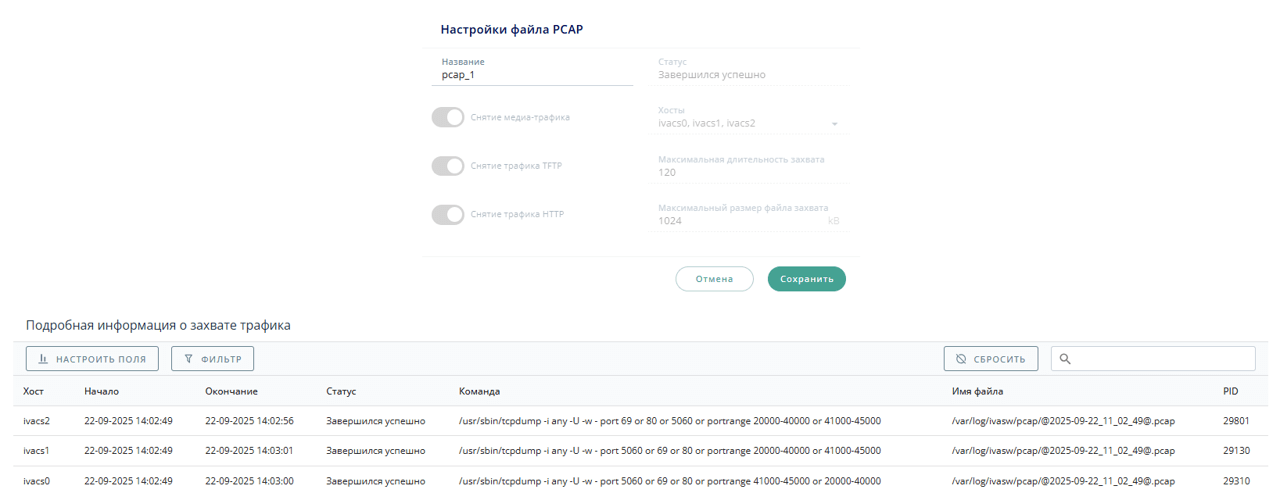 Во вкладке Файлы PCAP можно снять дампы сетевого трафика (PCAP-файлы).