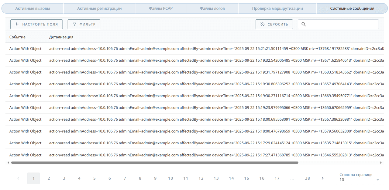Во вкладке Системные сообщения доступен просмотр системных событий.
