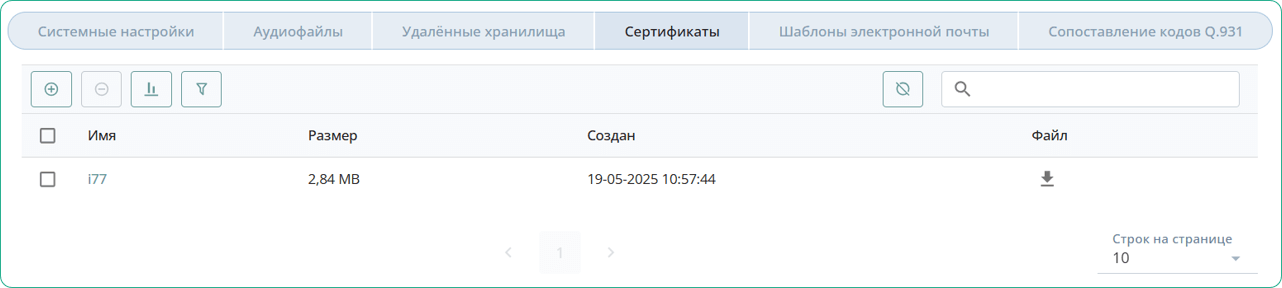 Во вкладке Сертификаты находятся TLS-сертификаты и приватные ключи, используемые для шифрования сигнального трафика.